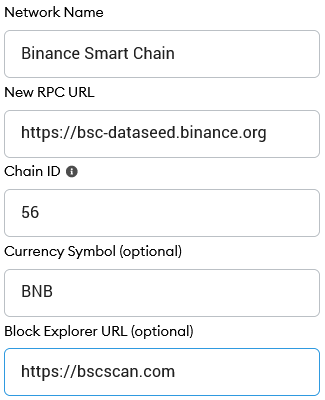 Block Explorer URL (optional): http://bscscan.com